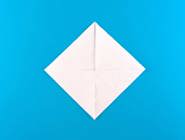 Obraťte čtverec na druhou stranu a opět přeložte rohy do středu tak, aby se dotýkaly. V prostředku každého rohu by měl být záhyb směrem do středu.