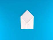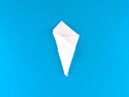 Nyní poskládaný papír otočte, stále ho mějte „nakoso“. Pravý roh přehněte směrem ke středu a přimáčkněte. Levý roh přehněte přes pravý a zastrčte dovnitř.