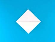 Poté čtverec pootočte „nakoso“ (prostě ho postavte na špičku), s přeloženými stranami směrem k vám. Vezměte horní roh svrchní vrstvy, přeložte jej směrem ke spodnímu rohu a přimáčkněte.